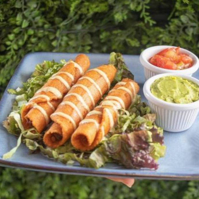 3 tacos pequeños de masa en una cama de lechuga, guacamole y pico de gallo