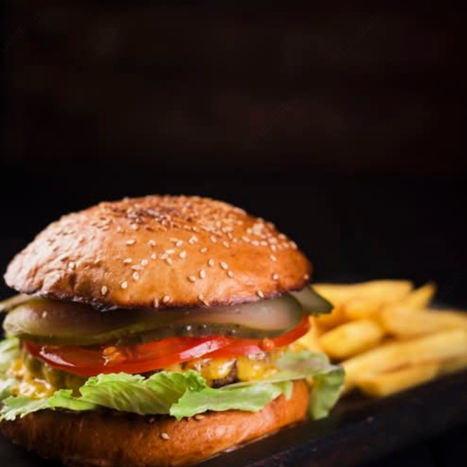 Pan brioche, torta de res angus, queso, cebollas, pepinillos, lechuga, tomate y aderezo