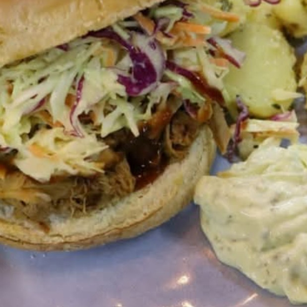 Hamburguesa con 100 gramos de Pulled Pork (12 horas ahumado) ensalada coleslaw, salsa bbq