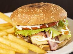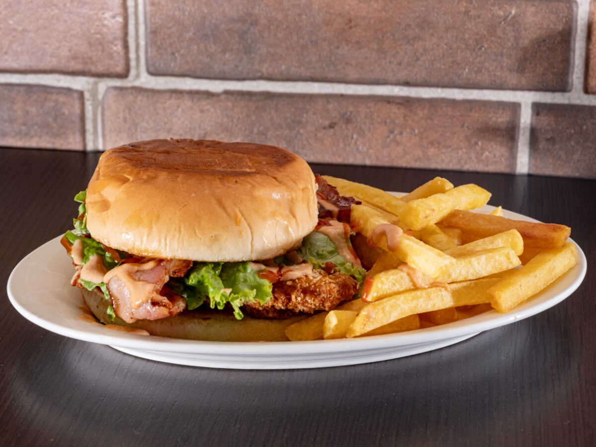 Deliciosa hamburguesa de pollo empanizado o a la plancha, queso mozarella, tomate, lechuga, tocineta y nuestra deliciosa salsa de la casa, Acompañada de papas fritas