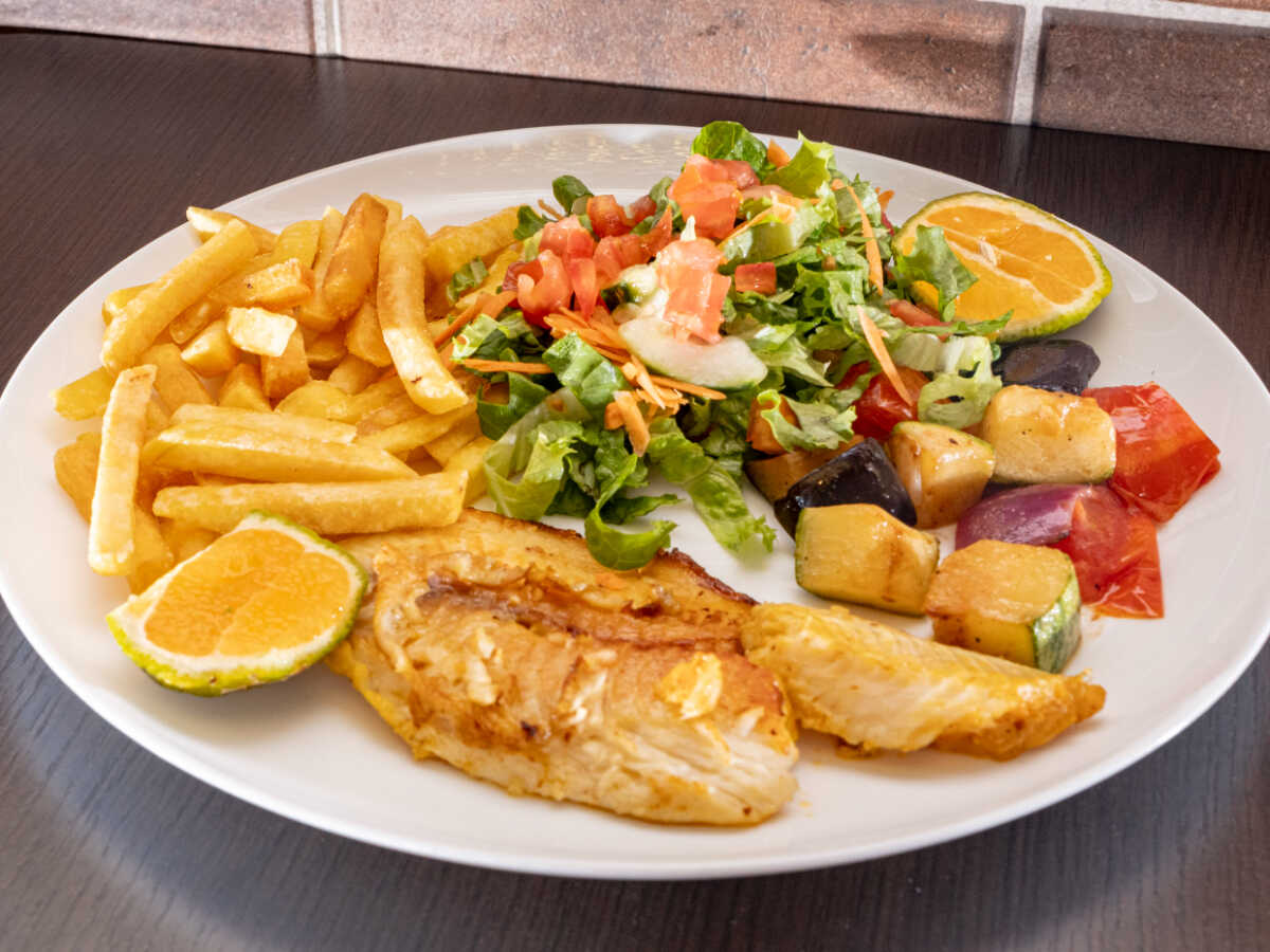 Filete de pescado al ajillo, papas fritas, vegetales salteados (brócoli, chayote, zanahoria) y ensalada verde.