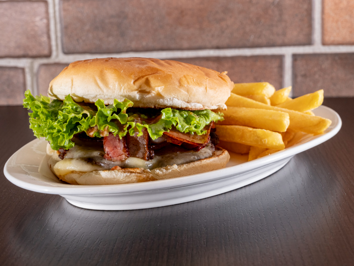 Hamburguesa con tocineta, jamon y queso mozarella con nuestra salsa de la casa Acompañada con papas fritas