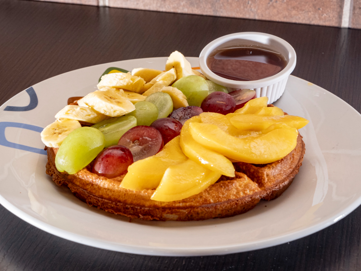 Delicioso wafle cubierto de frutas banano,fresa,melocoton y miel de maple