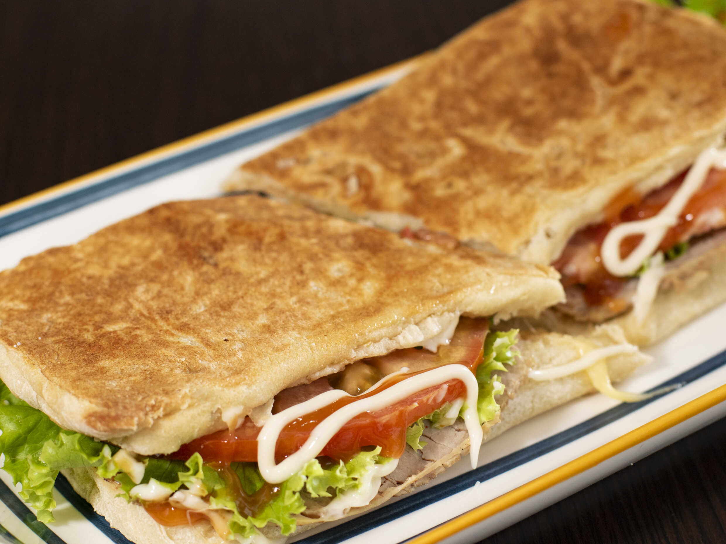 Pan Ciabatta, lechuga, tomate, queso mozarella, salsa de la casa.