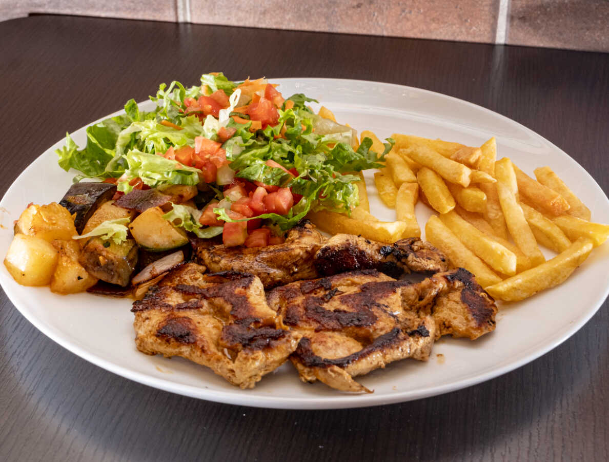 Pechuga de pollo a la plancha con cebolla caramelizada, papas fritas, vegetales salteados y ensalada verde.
