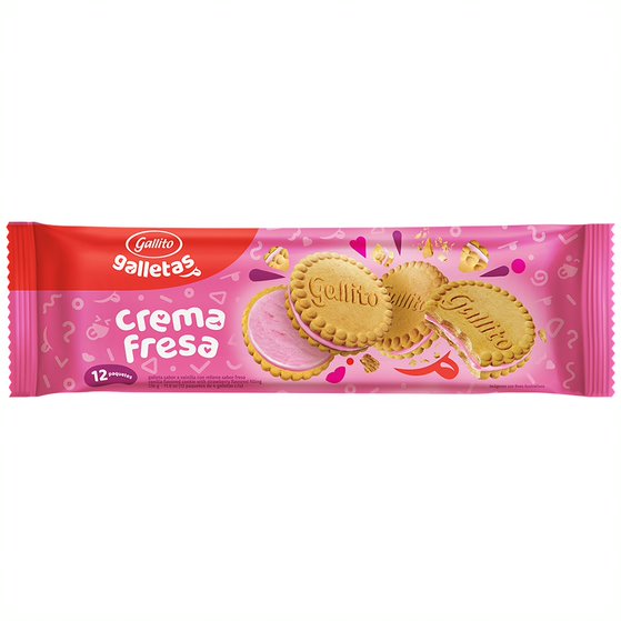 El icónico frescoleche de sabor de fresa, con topping de crema chantilly y topping de galleta Gallito de Fresa.