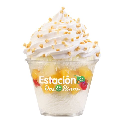 La combinación de helado a elegir y deliciosos trozos de frutas, con topping de crema chantilly y maní.