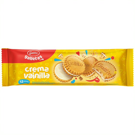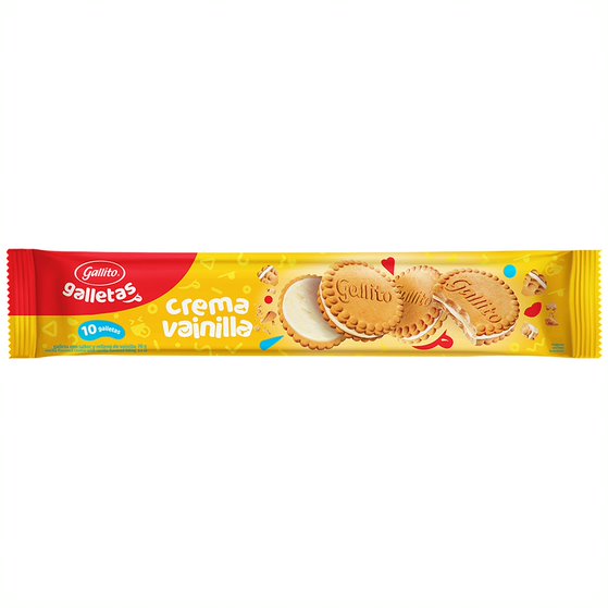 El icónico frescoleche de sabor de vainilla, con un borde de confite Morenito y caramelo, topping de crema chantilly y topping de galleta Gallito de Vainilla.