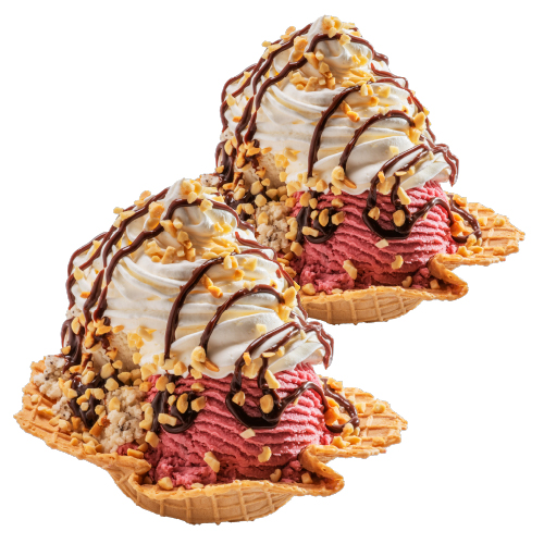 Una nueva forma de comer una banana Split, con una combinación de galletas choco chips con tus sabores de helados favoritos acompaña de toppings de sirope de chocolate y crema chantilly.