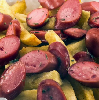 Exquisitas papas a la francesa con salchicha en rebanadas, salsa de tomate, mostaza y mayonesa.