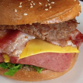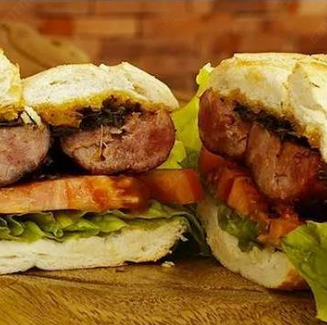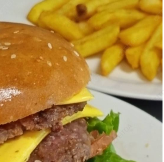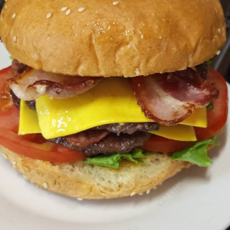 Hamburguesa con 2 tortas de carne, jamón queso y bacon, acompañada de papas fritas.