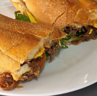 Delicioso pan baguette tostado, con carne mechada queso amarillo ,lechuga, tomate y salsa de mayonesa ,mostaza y tomate.