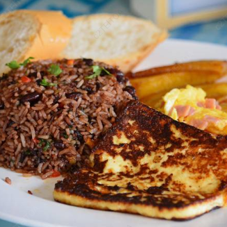 Delicioso gallo pinto con maduro queso huevo con jamón pan tostado.