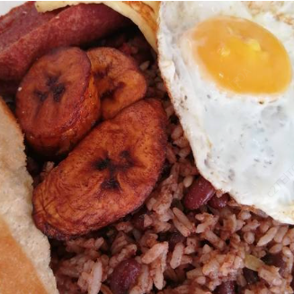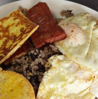 Delicioso gallopinto con huevo, salchichón, plátanos maduros, queso blanco y tostadas.