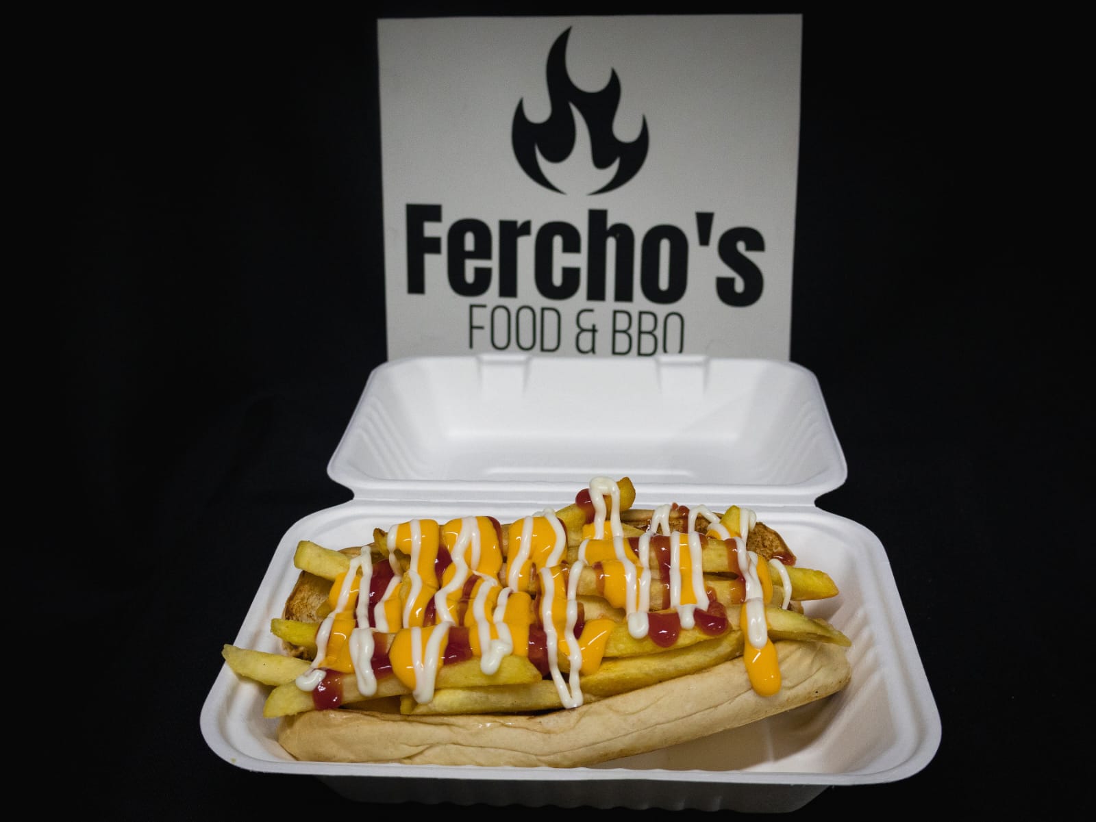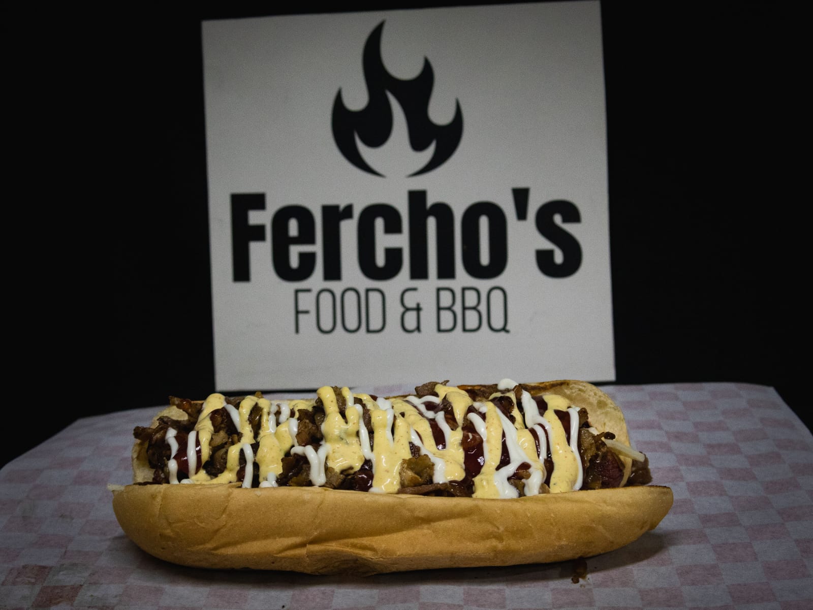 Delicioso hot dog ferchos, pan brioche, salchicha prime, cebolla caramelizada, queso suizo, tocineta y salsas de la casa.