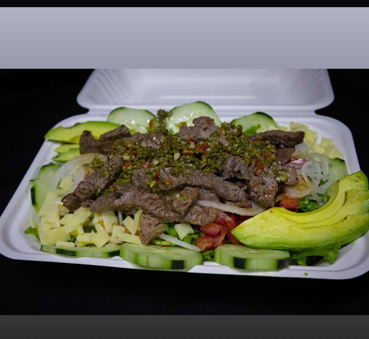 Deliciosa ensalada, lechuga, tomate, pepinos, aguacate, cebolla, queso suizo, 200 g de fajitas de lomo a la plancha al estilo gaucho, chimichurri argentino y aderezo italiano.