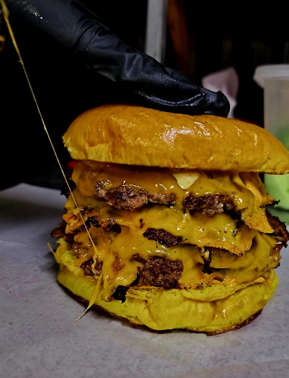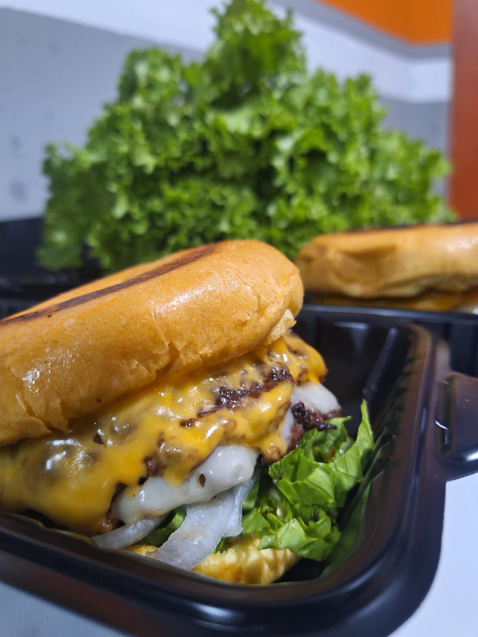 Deliciosa hamburguesa, pan de papa, masa madre, cebolla doble estilo oklahoma, triple queso cheddar, triple torta smash, salsa ferchos y salsa de trufa.