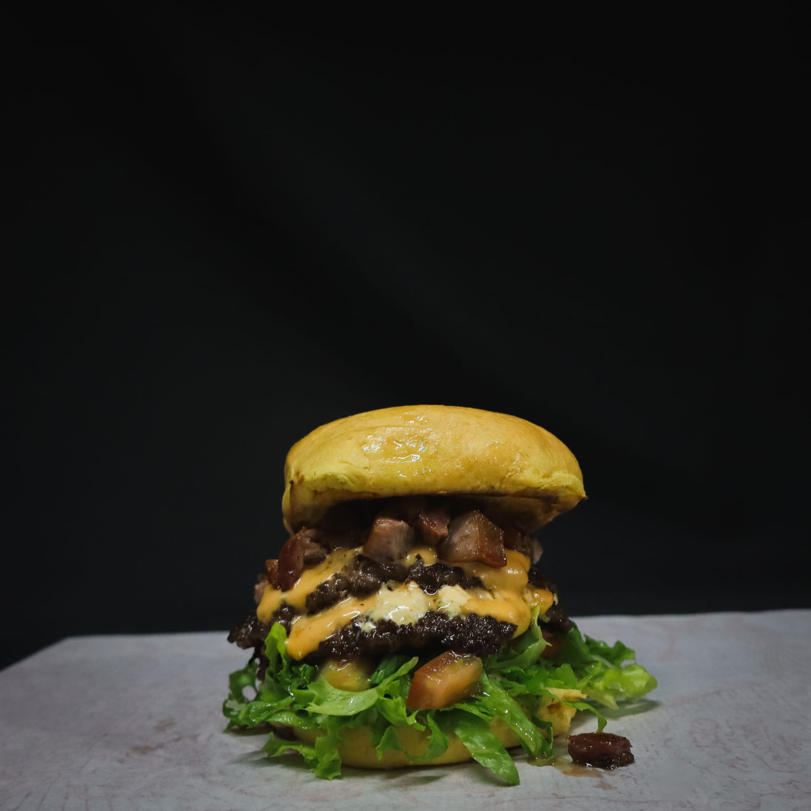 Deliciosa hamburguesa, pan de papa y masa madre, 2 tortas de carne premium, panceta de cerdo ahumada, tomate, lechuga, salsa ferchos y doble queso cheddar.