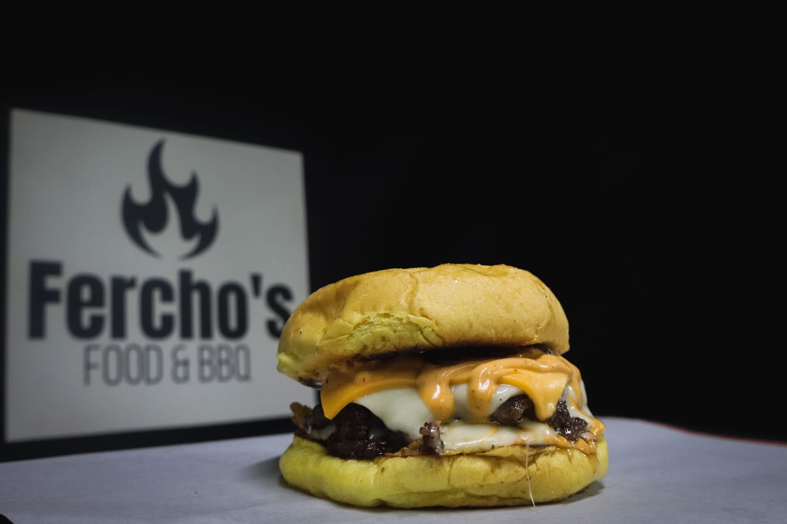 Deliciosa hamburguesa, pan de papa y masa madre, cebolla caramelizada, 2 tortas de carne premium, 1 tajada de queso cheddar, 2 tajadas de queso suizo, salsa ferchos y salsa chipotle.