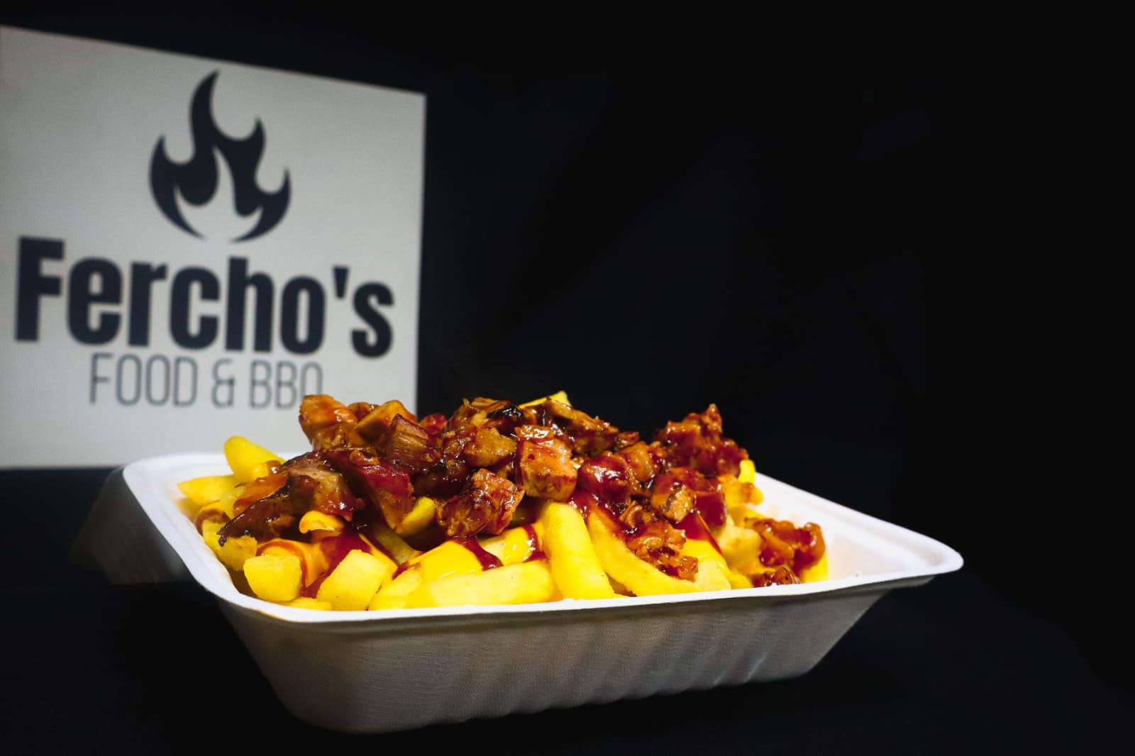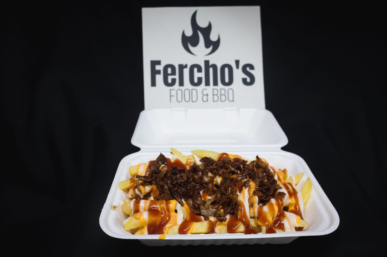 Deliciosas papas fritas, brisket ahumado por 14 horas, salsa de queso y salsa BBQ.