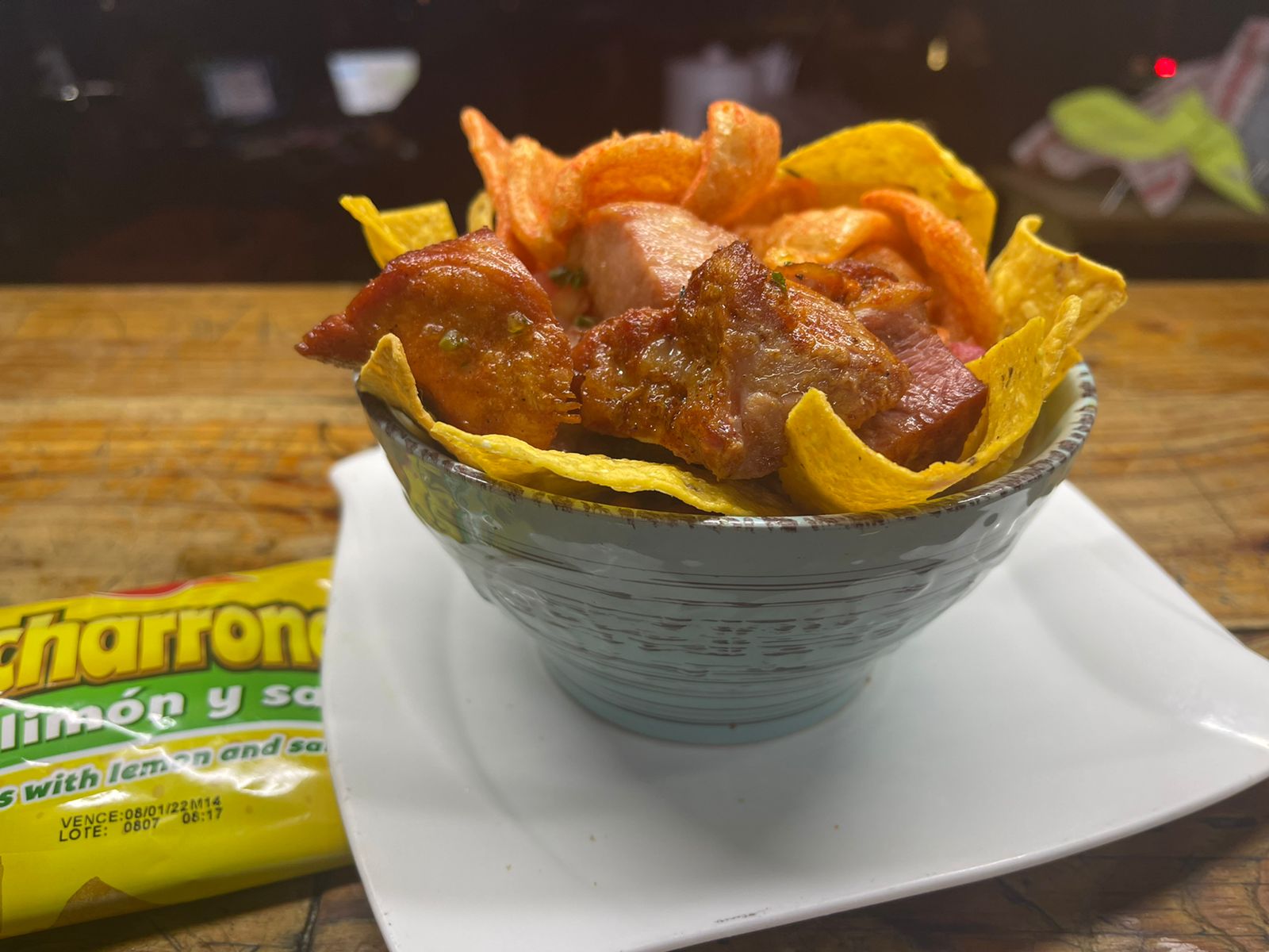 Chicharrón de cerdo (100g), charon de concha (30g), arroz, frijoles tiernos, pico de gallo, aguacate y piquitos.