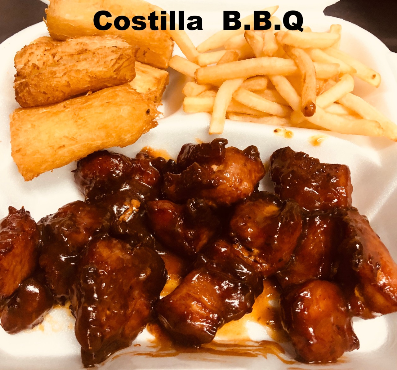 Combinacion de carnes, cerdo b.b.q, alas de pollo, camarones, dados de queso, patacones, yuca, ensalada, frijoles molidos,escabeche y salsas