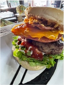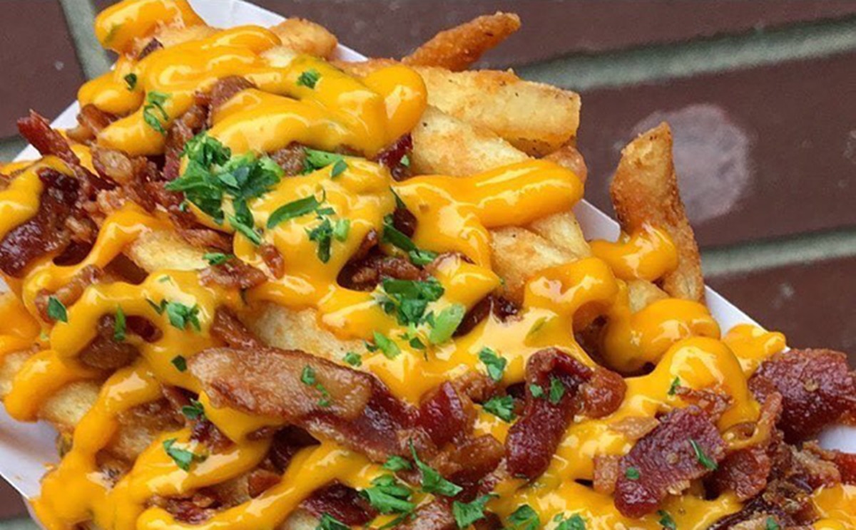 papas ala francesa, lechuga picada, tomate, carne a escoger, queso chedar, queso mozzarella, tocino, natilla y salsas.