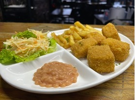plato estrella, aderezado con nuestra salsa spicy, acompañado con galleta soda y escabeche de banano