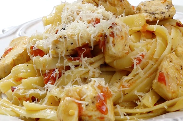 Espagueti con Pollo, Quesos y Tocino Seco