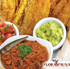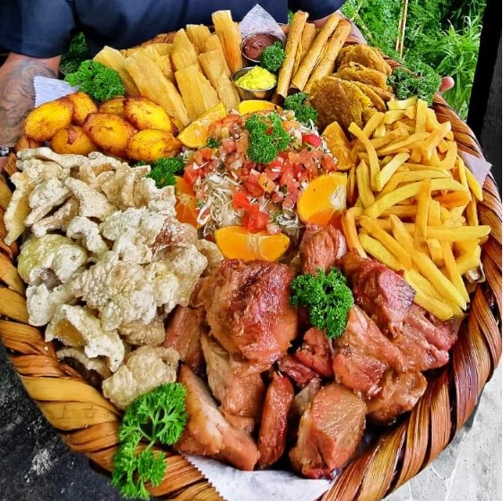 Patacones, yuca, plátanos maduros, chicharrón de concha, chicharrón de carne, papas, tacos y ensalada.