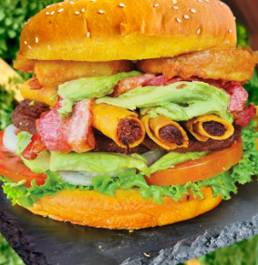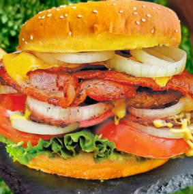 Con aros de cebolla, tomate, lechuga, queso y papas fritas.