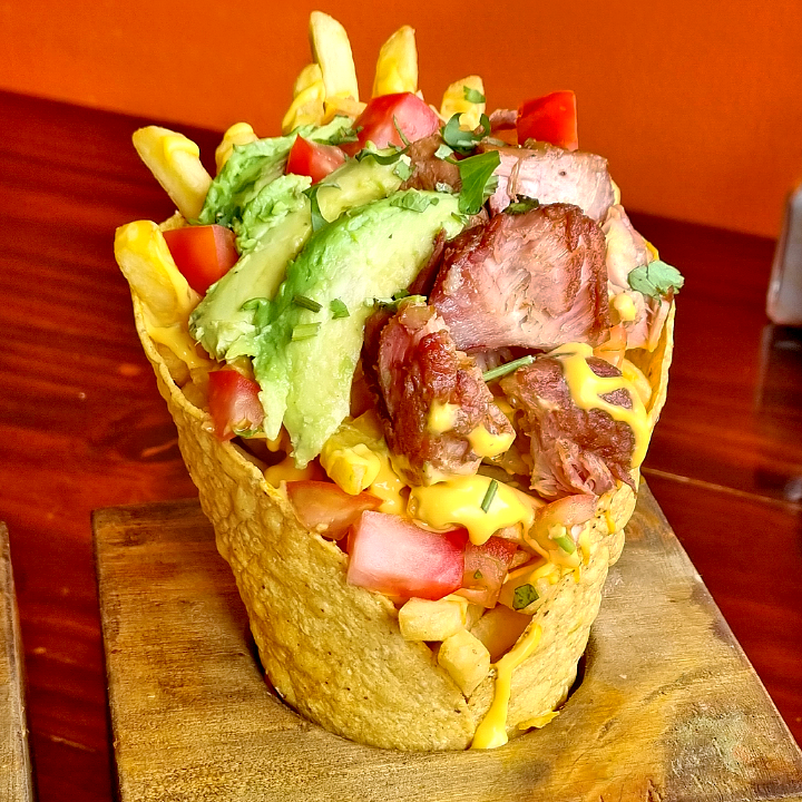 Papas fritas, queso mozzarella, pico de gallo y camarones.