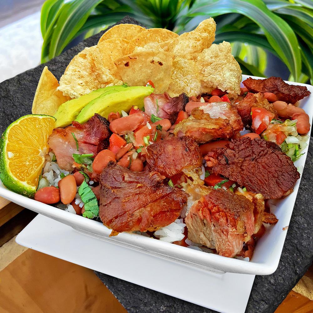 Arroz, frijoles, pico de gallo, chicharrón de carne, chicharrón de concha y aguacate 200 g.