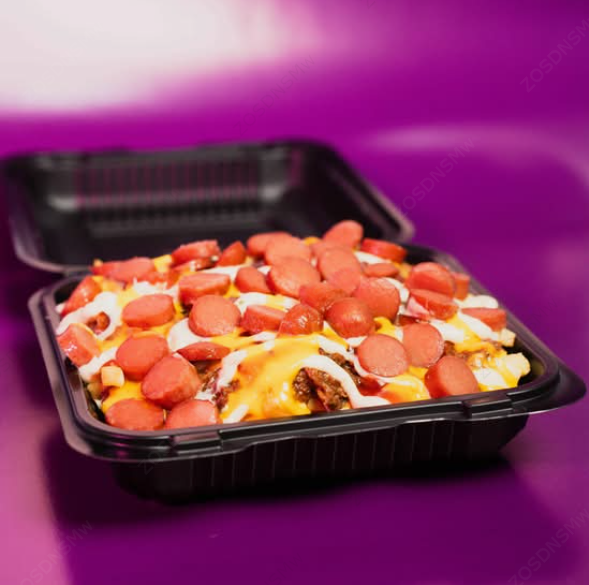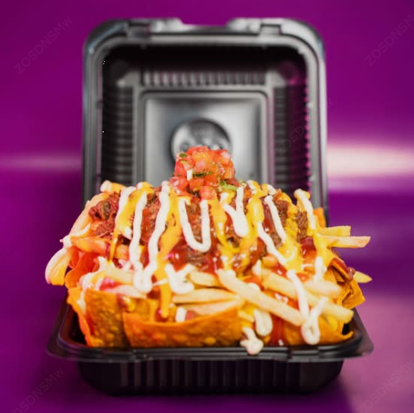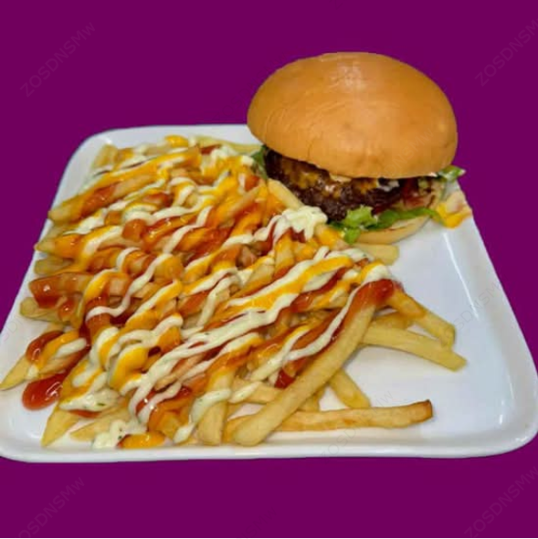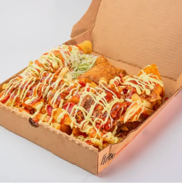 Papas fritas, salchichas, carne mechada de la casa, acompañas de salsas de la casa y cubiertas de queso mozzarella.
