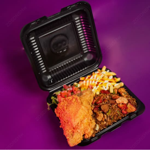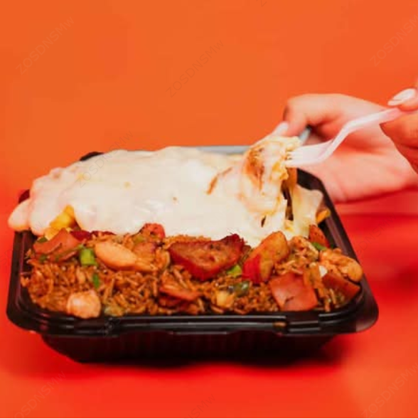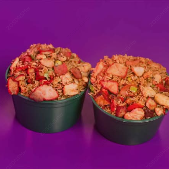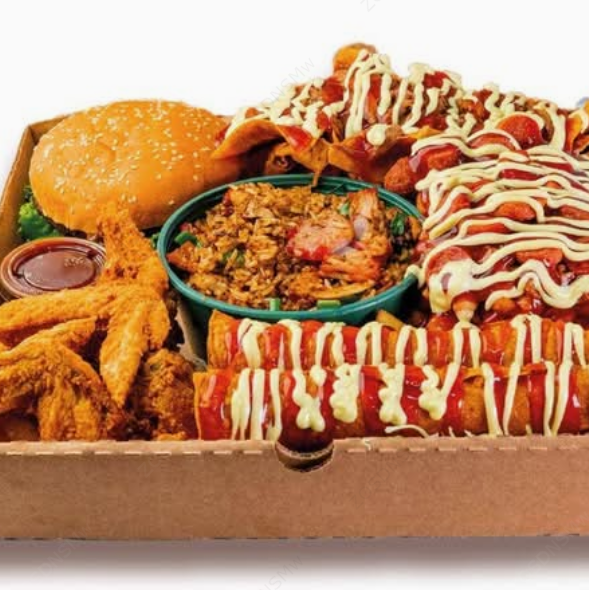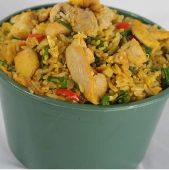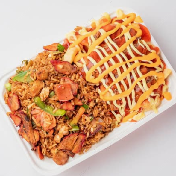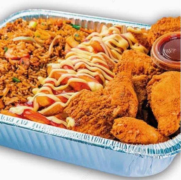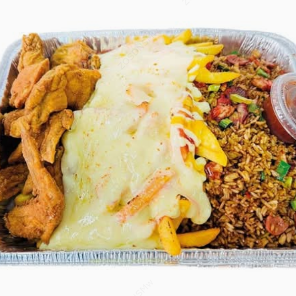 1 kg De arroz cantones, 1 kg de papas fritas cubiertas con queso mozzarella, 6 pzas de pollo.