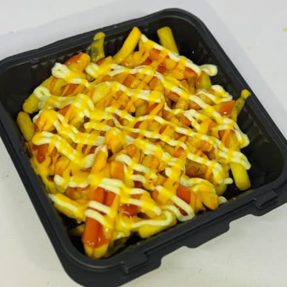 Papas fritas acompañadas con trozos de salchicha, servidas con salsa y mayonesa.