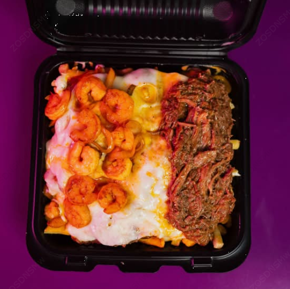 Papas fritas, con carne mechada de la casa, salsas de la casa, cubiertas de queso mozzarella encima.