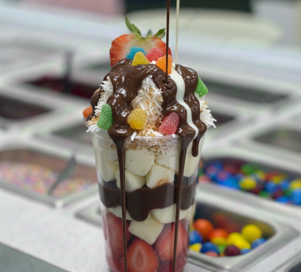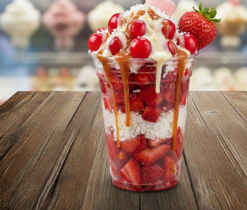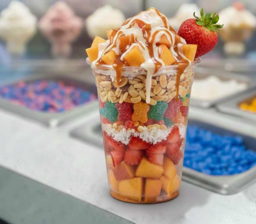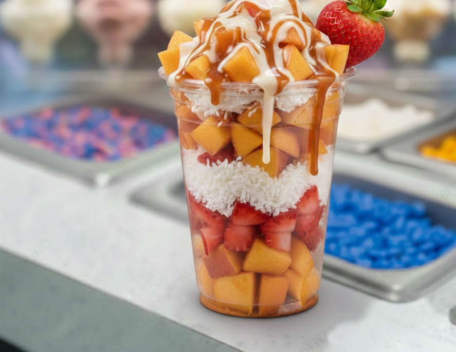 Delicioso Vaso relleno de tu Fruta Favorita con Coco acompañado de 2 Topping Liquidos.