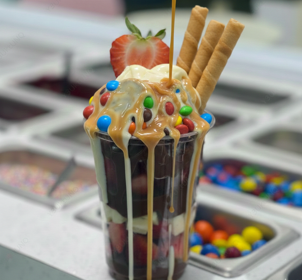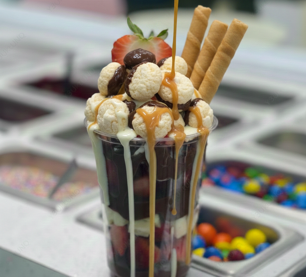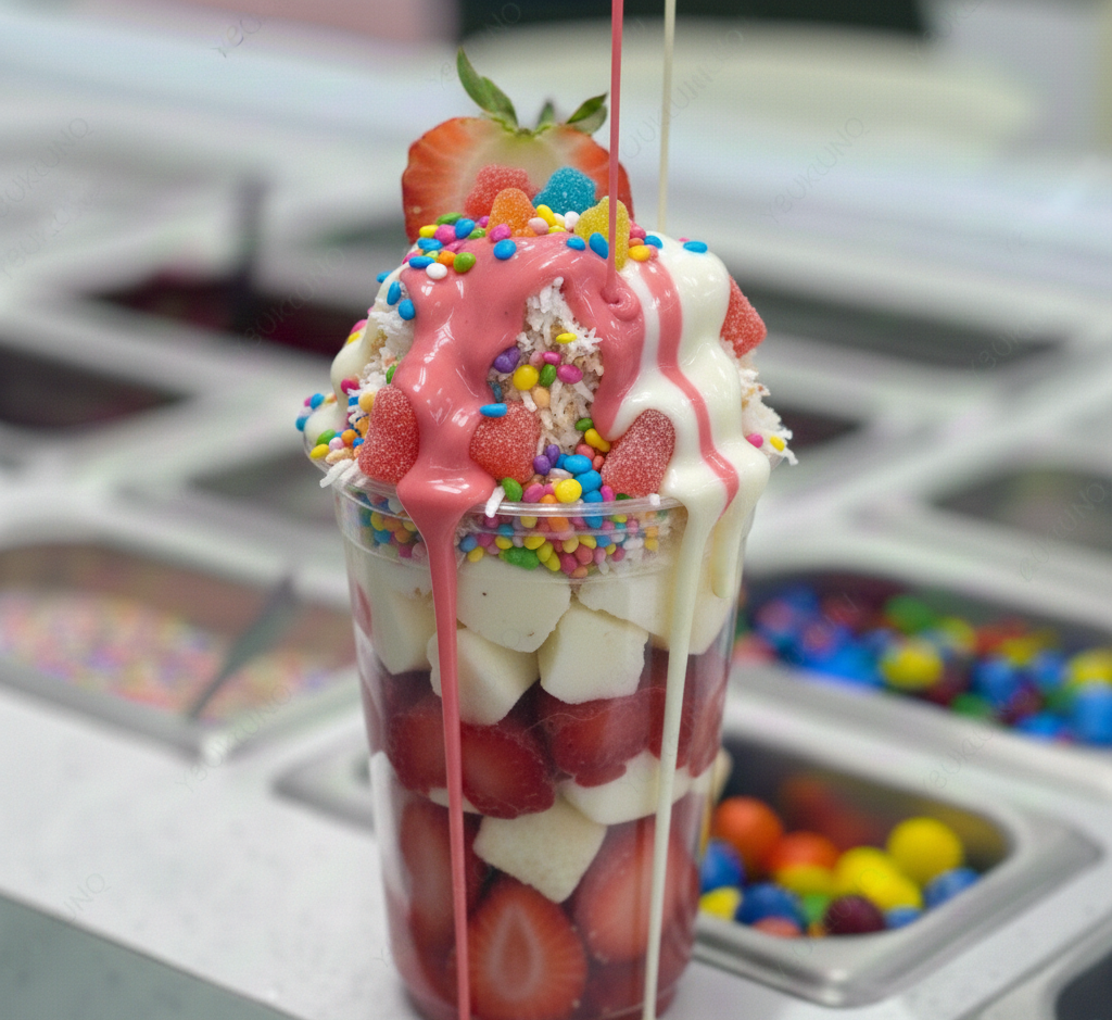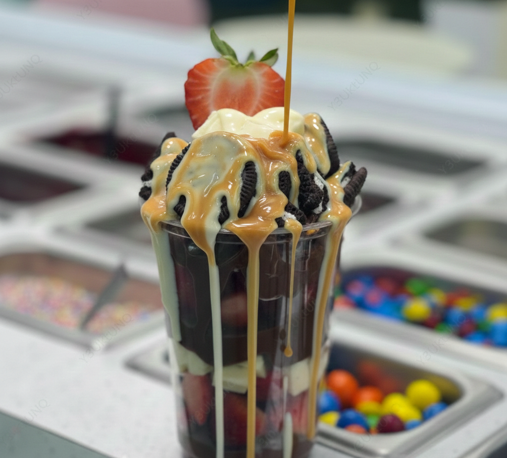 Delicioso Vaso relleno de tu Fruta Favorita con Oreo acompañado de un Topping Solido y 2 Liquidos.