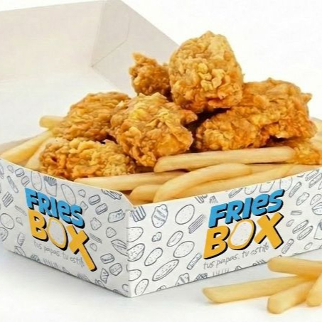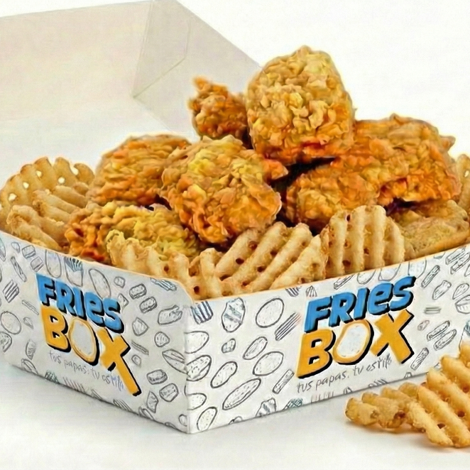 Papas fritas tradicionales servidas con jugosos trozos de pollo empanizado y crujiente.