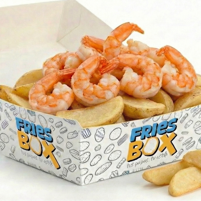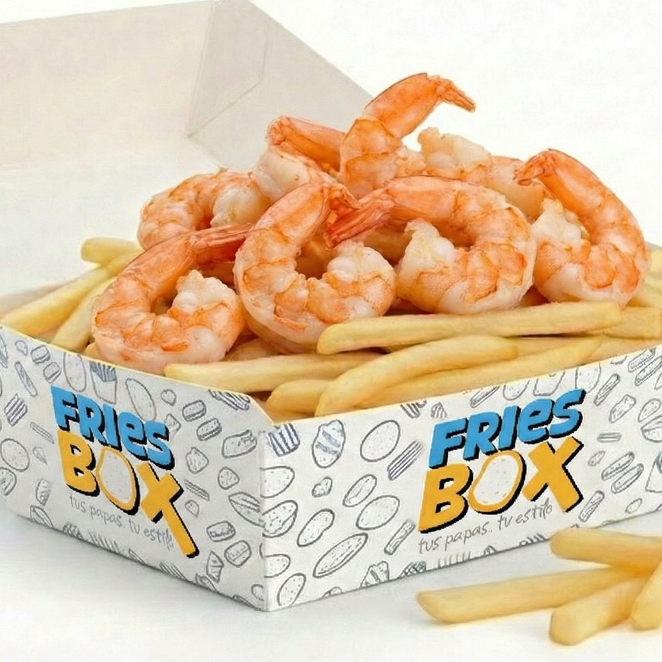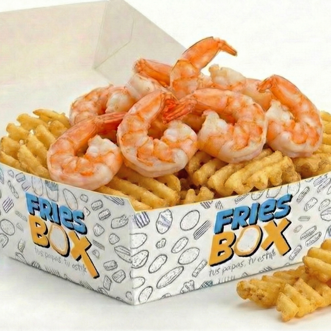 Papas fritas tradicionales acompañadas de camarones frescos salteados.
