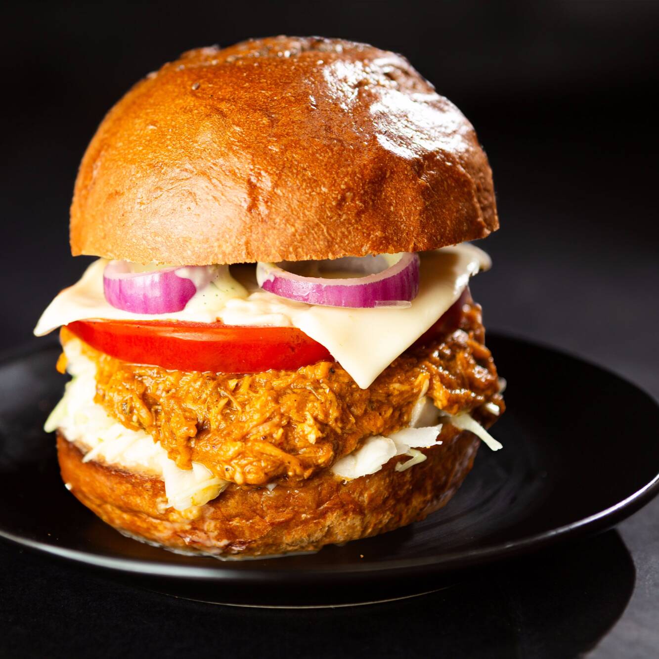 Hamburguesa con carne mechada sazonada con salsa BBQ, acompañada de lechuga, tomate y cebolla morada a la plancha, queso blanco.