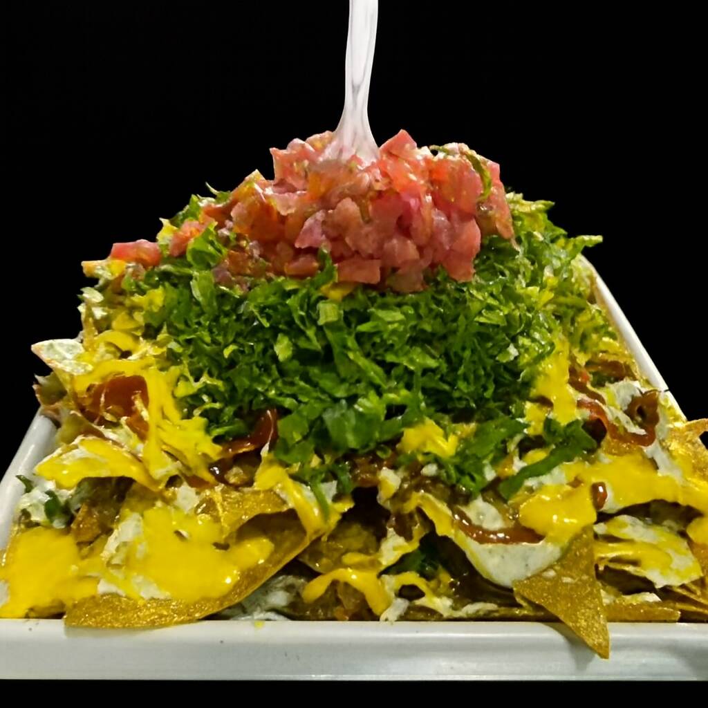 Nachos hechos de tortilla de maiz frescas, acompañadas de lechuga, pico de gallo, salsa de queso y nuestra salsa de la casa.
