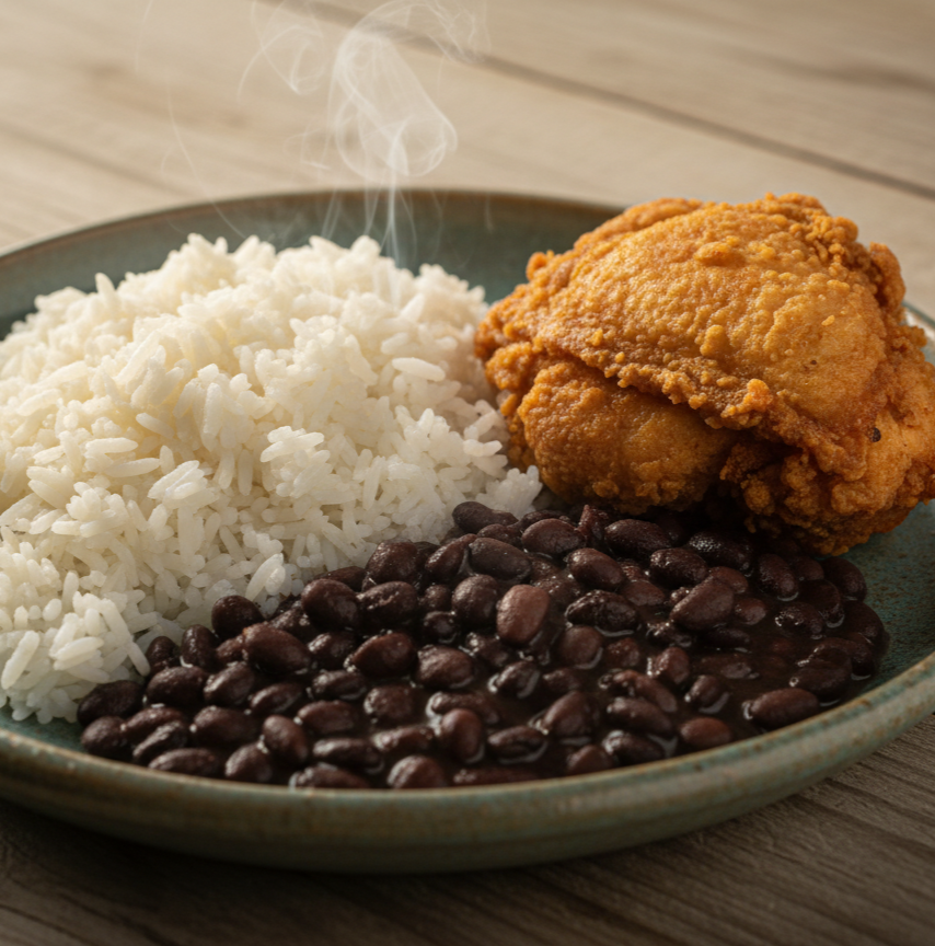 ¡El sabor de nuestra tierra en su versión más honesta! Arroz blanco sueltito, frijoles negros bien sazonados y una pieza de pollo frito con un empanizado dorado y súper crujiente