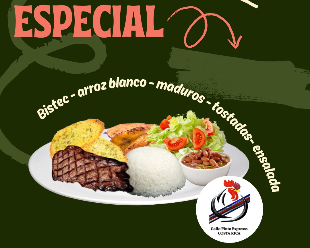 Arroz y frijoles, proteína Bistec, acompañado unos deliciosos maduros, con una exquisita ensalada y unas tostadas de pan de ajo.