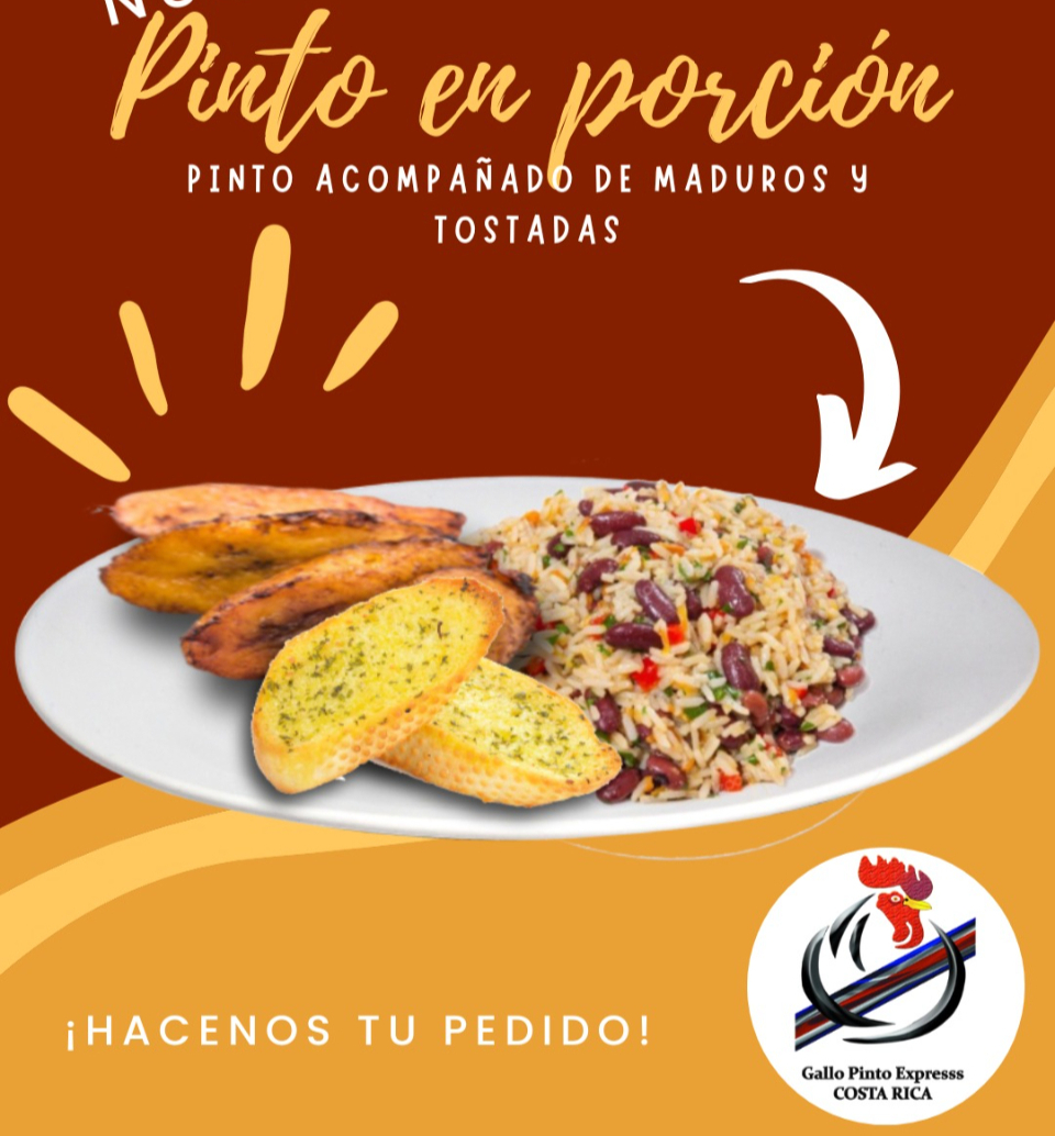 Delicioso gallo pinto con Huevo, salchichón, queso y natilla acompañado de deliciosos plátanos maduros y tostadas recién hechas.
