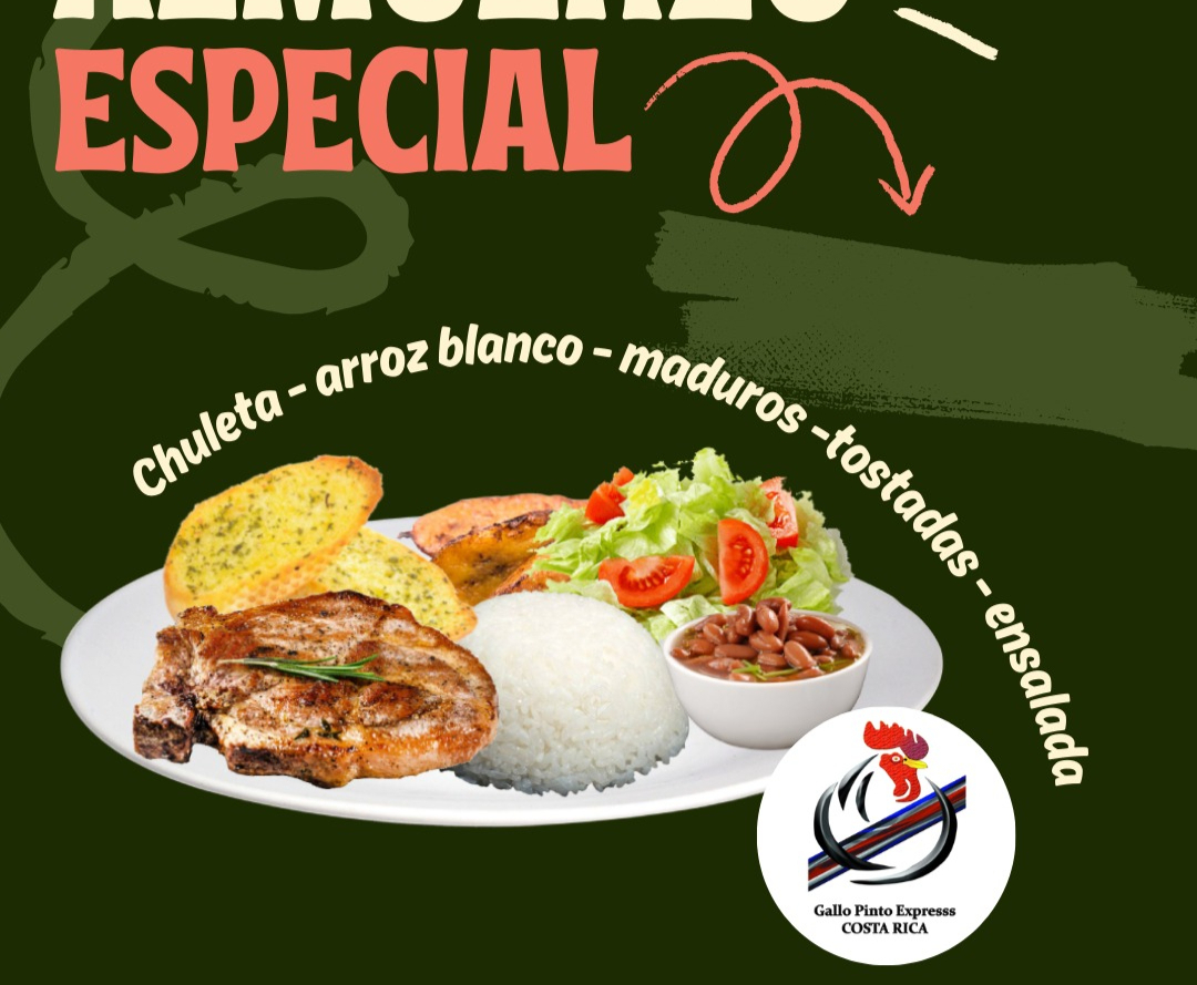 Arroz y frijoles, con proteína de Chuleta de Cerdo, acompañado unos deliciosos maduros, con una exquisita ensalada y unas tostadas de pan de ajo.