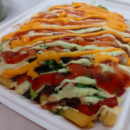 Ingredientes, papa, arreglada con carne mechada, frijol molido, lechuga, bañado en salsas especiales.