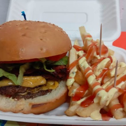 Doble torta,doble queso, tomate, lechuga, cebolla, tocino, salsas y papas.