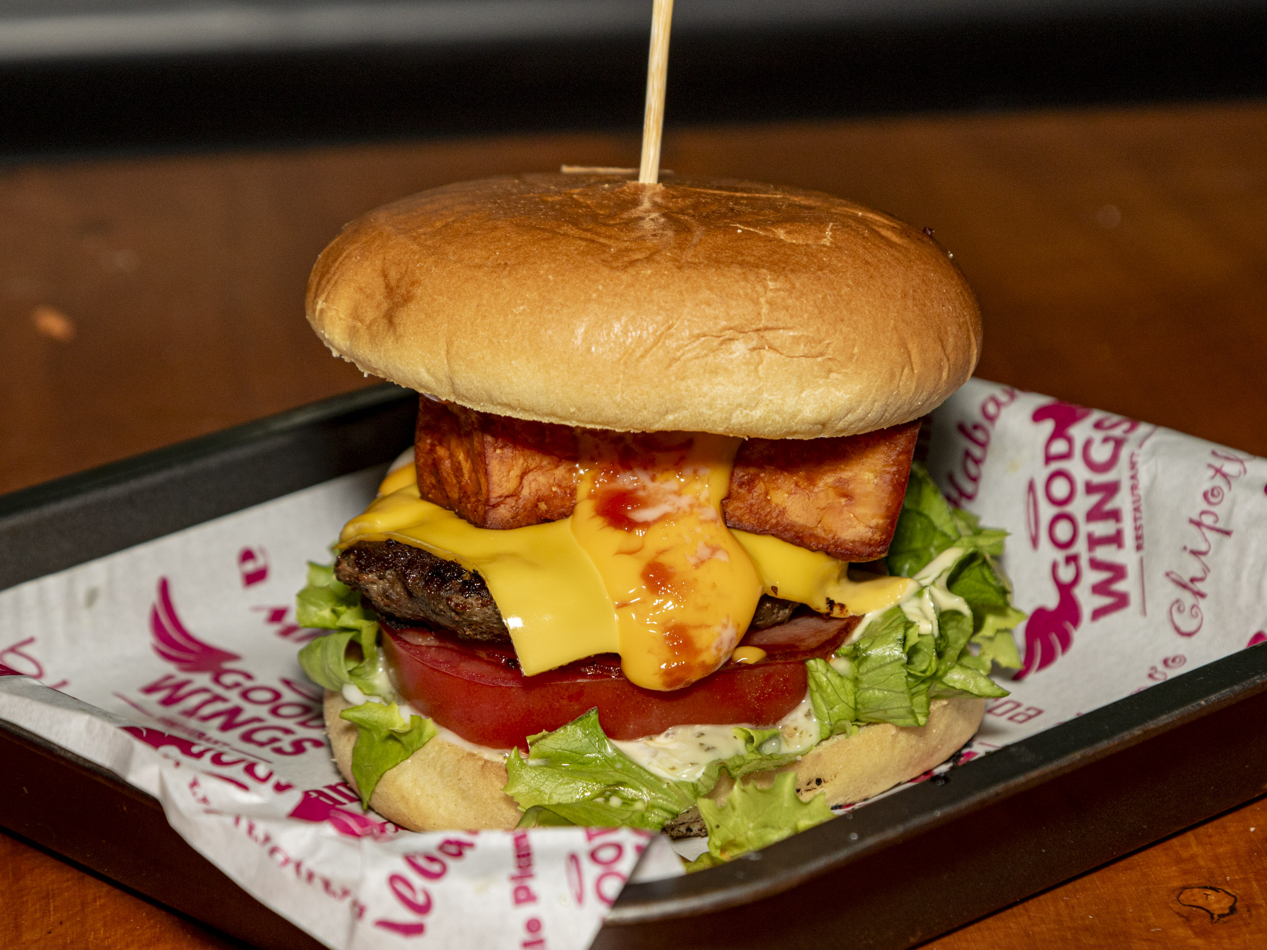 2 Alas enteras, hamburguesa clásica y papas fritas.